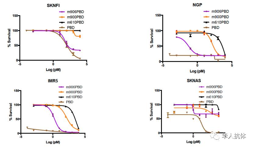 ADC efficacy的影響 會議中Dimitrov簡要介紹了一些ADC類藥物中epitope和affinity對efficacy的影響。在Feng et al的一項研究中,m900 和m906是兩個anti-CD56抗體。m906的binding epitope是membrane distal domain,m900的binding epitope是membrane proximal domain。兩個抗體的親和力相近:m906是4.5nM,m900是2.9nM。Feng et al將這兩種抗體分別構建成pyrrolobenzodiazepine dimer (PBD)的antibody-drug conjugate。結果發現m906的in vitro cytotoxicity 明顯優于m900(圖六),其中一個重要原因是m906的internalization比m900更好。這項研究表明,某些情況下,選擇membrane distal epitope對于某些ADC類藥物可能更佳。Dimitrov認為,對于ADC類藥物,如果抗體的親和力(affinity)相近,不同的表位,不同的avidity,和不同的internalization 可能也會造成ADC的efficacy不同。
