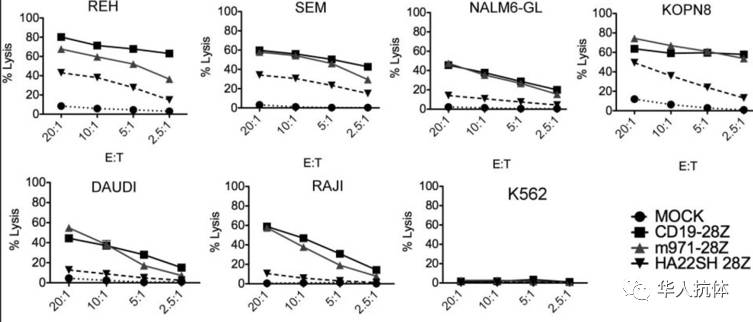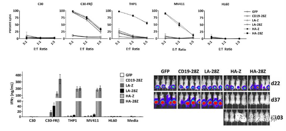 Haso等人對比了上述兩種CAR和CD19-28z CAR(由FMC63 scFv構建而來)的體外活性。CD19比較小,所以anti-CD19 FMC63 scFv 的binding epitope 相當于membrane-proximal epitope(圖一)。他們發現m971-28z的體外活性和CD19-28z的體外活性相當,兩者均比HA22SH-28z的體外活性好。(圖三) 圖三. (圖片摘自于Haso et al. Blood, 2013) 2. 相同Epitope, 不同antibody affinity對CAR efficacy的影響 在另一項研究中,Lynn et al對比了兩種有overlapping epitope的CAR。其中HA-FRb scFv的親和力為2.48nM,LA-FRb scFv的親和力是54.3nM。研究發現,高親和力的HA-FRb CAR的體外和體內活性均比低親和力的LA-FRb CAR要好。(圖四)