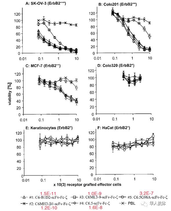 值得注意的是,overlapping epitope的情況下,提高affinity可能會相應地提高CAR efficacy,但是當affinity達到一個程度以后,再提高affinity,不一定會有相應的efficacy的提高,這種情況被稱為affinity threshold。比如,Chmielewski et al 在2004年發表在J of Immunology上的一項研究中,使用了一系列的anti-ErbB2 scFv構建CAR。這些scFv的親和力在3.2E-7到1.5E-11 M之間 。研究發現,當抗體親和力達到一定程度后(Kd<1E-8 M),親和力繼續提高對in vitro efficacy沒有顯著影響,而且這些不同親和力的CAR在不同ErbB2 expression level的細胞上的efficacy也很相近。但是低親和力的CAR(Kd>1E-8 M)和高親和力的CAR (Kd<1E-8 M)的效果卻有明顯差別。具體結果見圖五。圖五:不同affinity的CAR對不同ErbB2 expression level 細胞的lysis。紅色數字是5個scFv的Kd (M)。